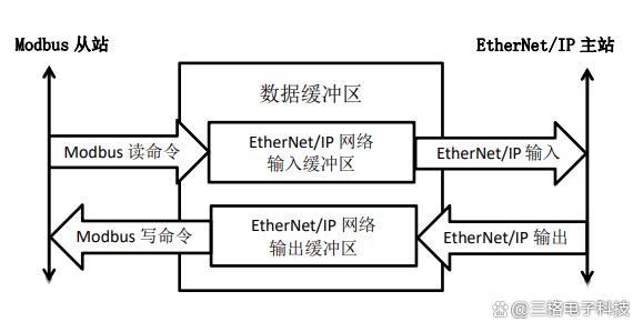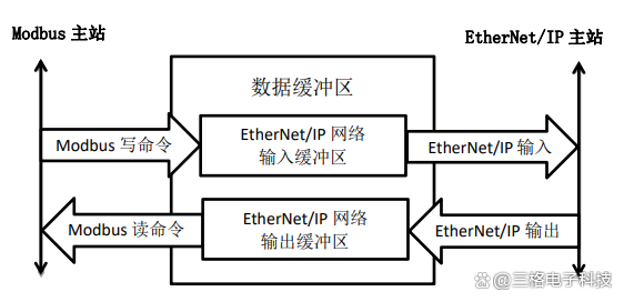 透明通信:用户可以依照 EtherNet/IP 通信数据区和 Modbus TCP 通信数据区的映射关系,实现 EtherNet/IP 到 Modbus TCP 之间的数据透明通信;