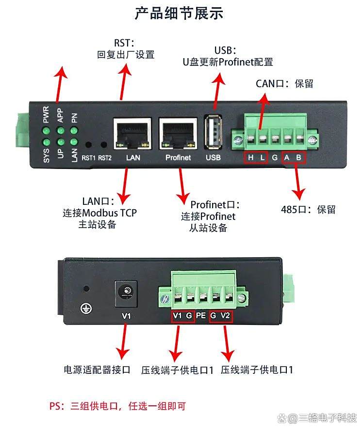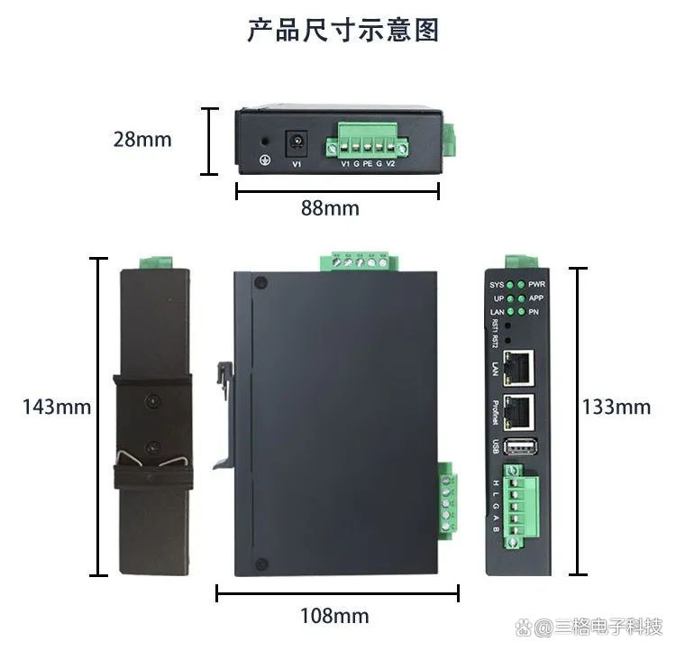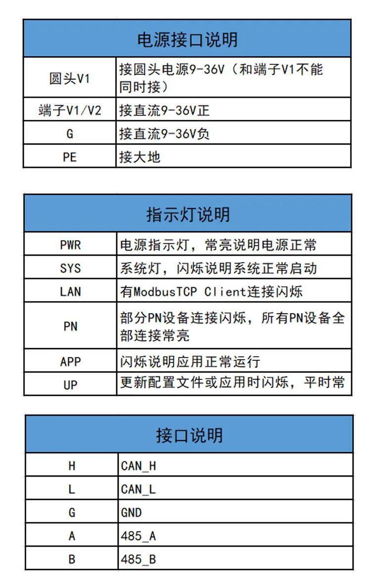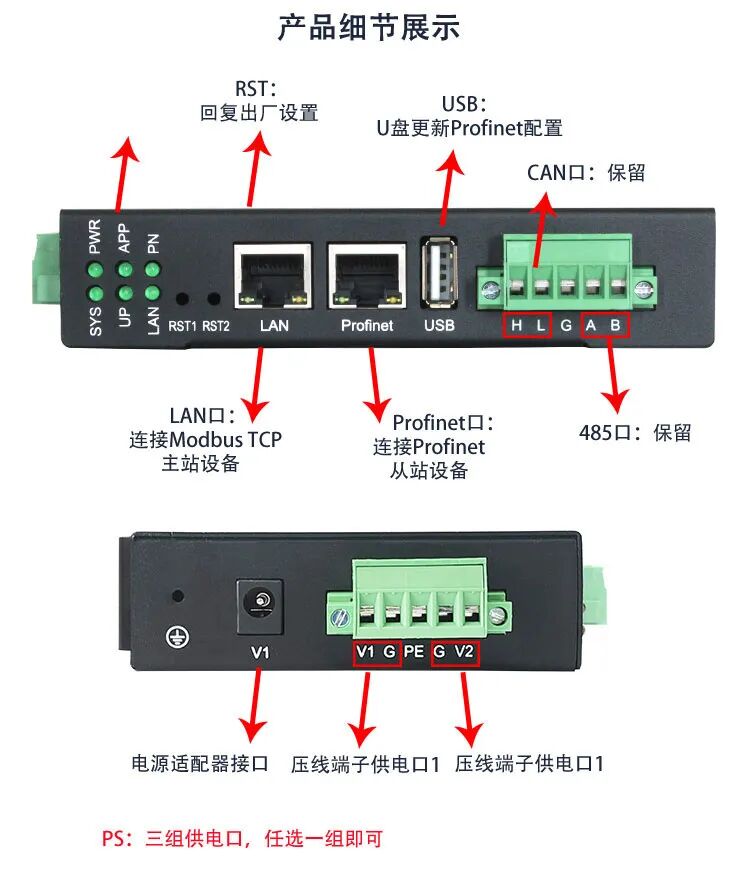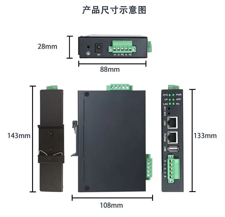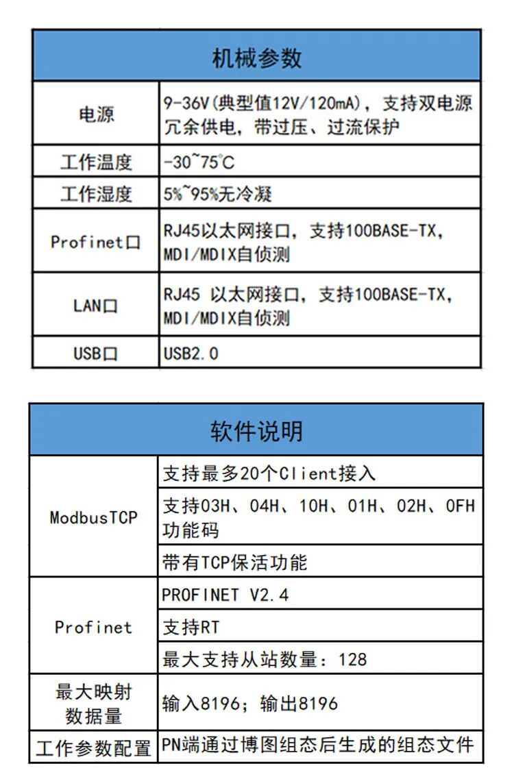 Modbus TCP侧支持 03H、04H、10H、01H、02H、0FH功能码,最多支持20个client 连接;Profinet 侧支持PROFINET V2.4。