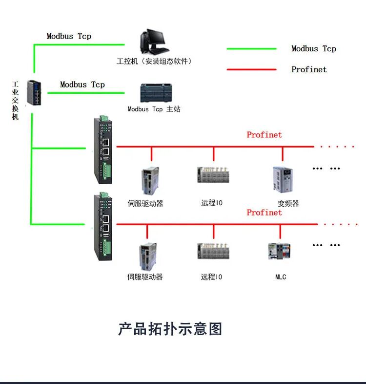 网关在Modbus TCP侧作为Modbus TCP从站,接PLC、上位机、wincc屏等;在Profinet侧做为Profinet主站控制器,接Profinet设备,如伺服驱动器。
