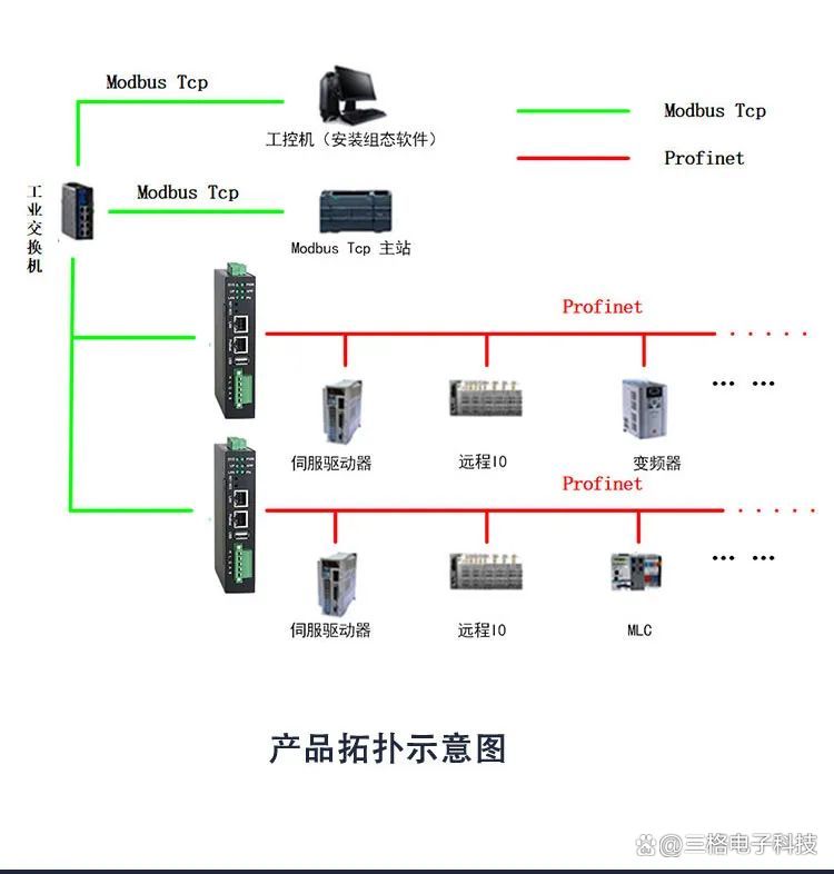 Modbus TCP Client通过ModbusTCP控制Profinet接口设备,Profinet接口设备接入DCS/工控机等。