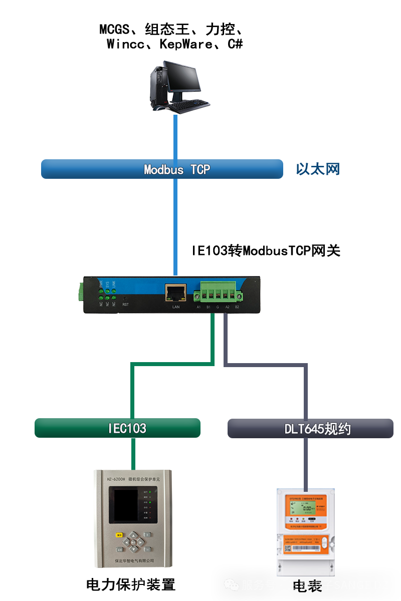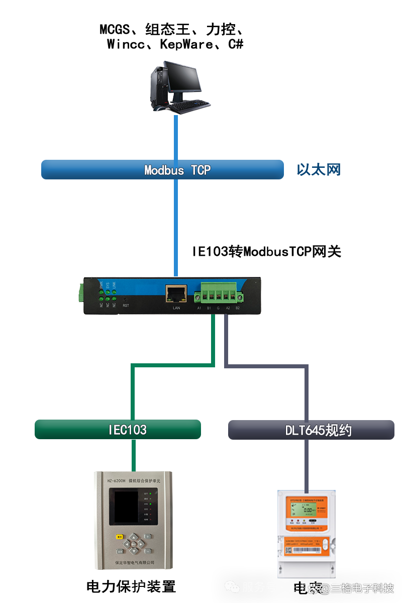 IEC103转ModbusTCP网关型号SG-TCP-IEC103,是3044AM永利集团推出的工业级网关(以下简称网关),主要用于IEC103数据采集、DLT645-1997/2007数据采集,IEC103支持遥测和遥信,可接微机综合保护单元、电力系统微机保护单元、电表等,将采集到的数据转换为ModbusTCP协议数据,对接ModbusTCP主站、组态屏、MES系统等。网络拓扑图如下: