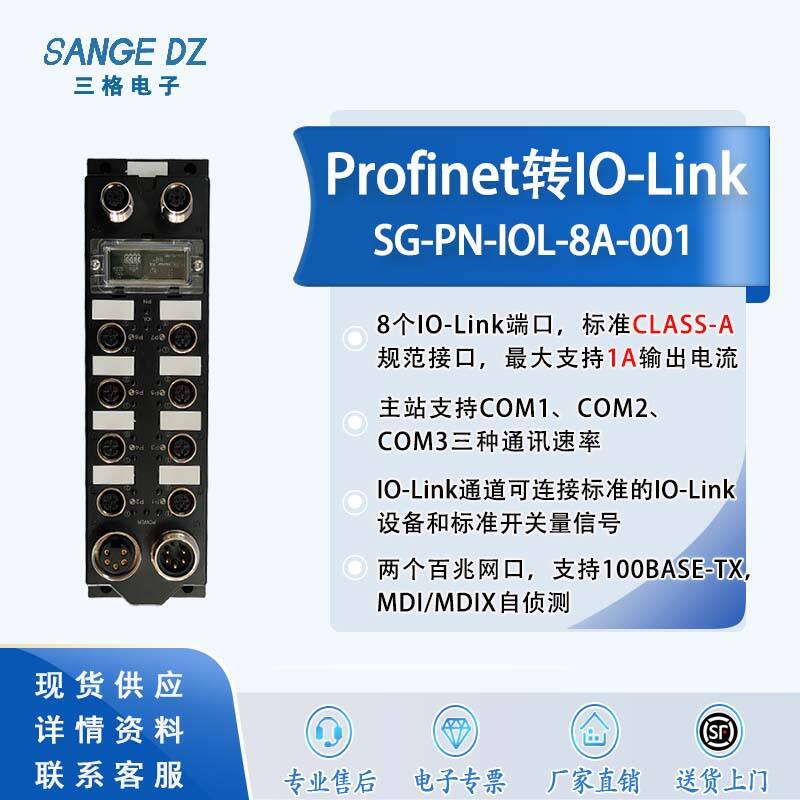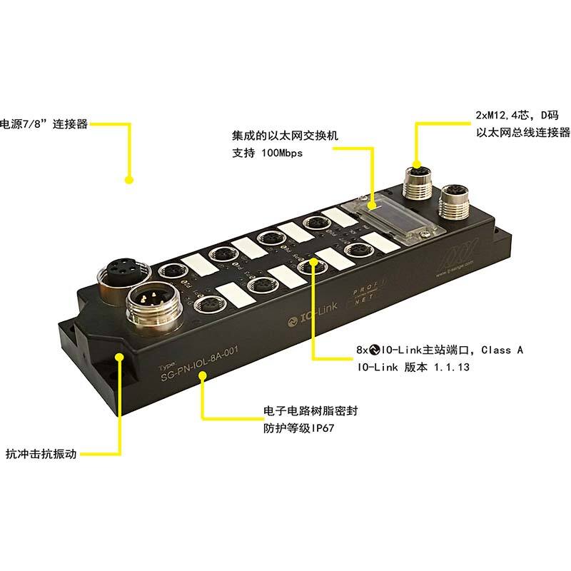 SG-PN-IOL-8A-001网关是Profinet从转IO-Link主的网关设备,可以将IO-Link从站设备接入Profinet系统,通过该网关可实现传感器及驱动器与控制器之间的信息交互。网关有两个百兆网口和8个IO-Link端口,支持COM1、COM2、COM3三种通讯速率,可以连接各品牌的IO-Link传感器及IO-Link从站设备,同样也可连接普通开关量信号的传感器和执行器等。