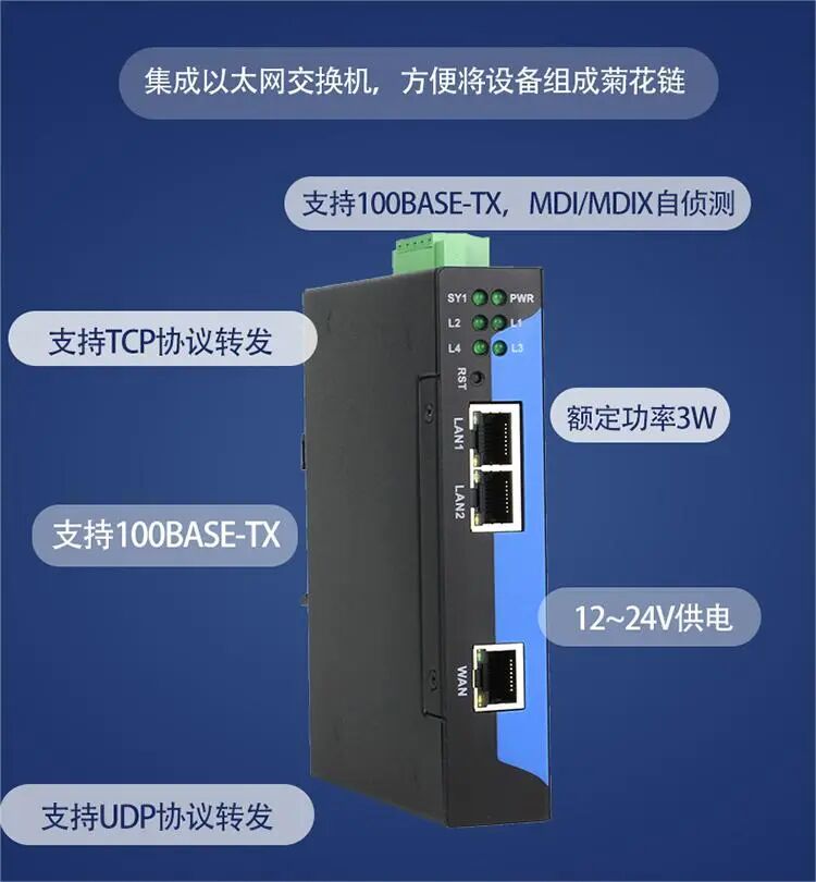 NAT网关支持 IP 地址跨网段转换、通讯端口转换、8 个通道的 TCP/UDP 通讯配置、多个设备连接和 WEB 配置各项参数。