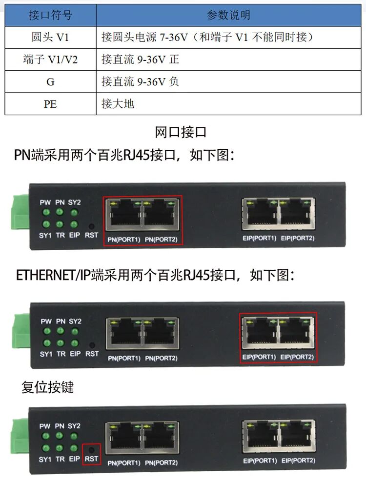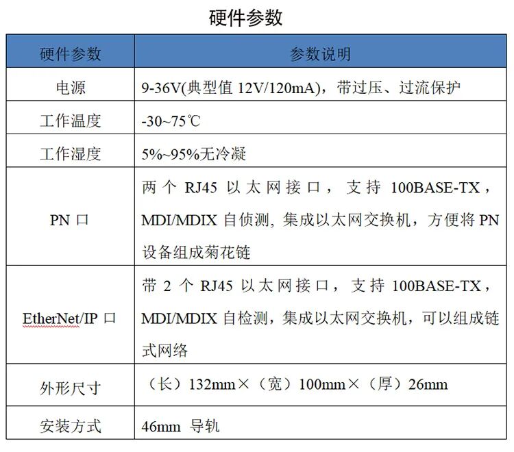 本产品在PN侧作为PN IO从站,接PN主站设备,比如西门子PLC等;在EtherNet/IP侧做为EtherNet/IP从站,接EtherNet/IP主站设备,比如欧姆龙PLC等,用户不需要了解具体的PN和EtherNet/IP协议即可实现PN主站设备和EtherNet/IP主站设备之间的数据交互。