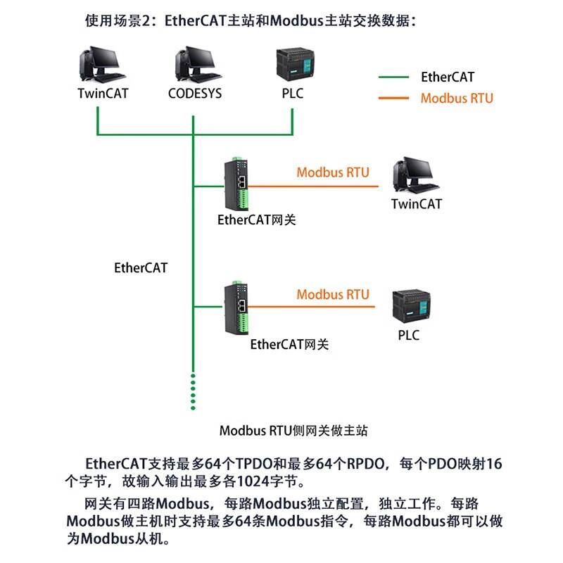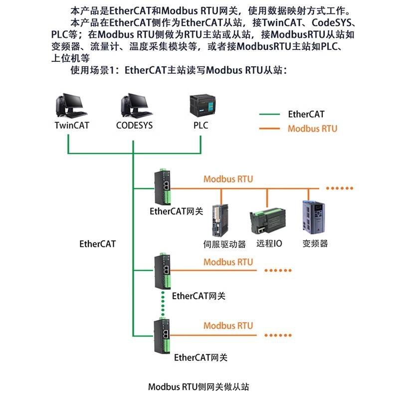 本产品是 EtherCAT 和 Modbus RTU 网关,使用数据映射方式工作。本产品在 EtherCAT 侧作为 EtherCAT 从站,接 TwinCAT、CodeSYS、PLC等;在 Modbus RTU 侧做为 RTU 主站或从站,接 ModbusRTU 从站如变频器、流量计、温度采集模块等,或者接 ModbusRTU 主站如PLC、上位机等。